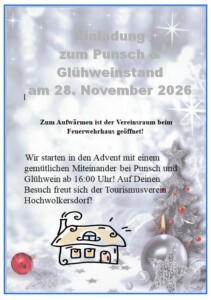 Wir starten in den Advent mit einem gemütlichen Miteinander bei Punsch und Glühwein ab 16:00 Uhr! Auf Deinen Besuch freut sich der Tourismusverein Hochwolkersdorf!